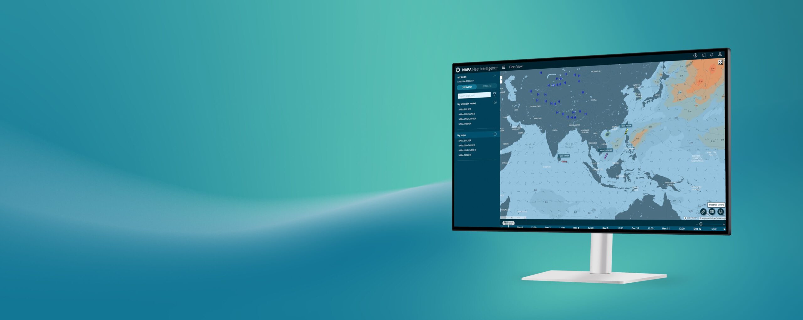 From port delays to weather risks and emissions zones, shipping operations are more dynamic than ever. NAPA’s Fleet View module gives you a real-time operational overview of your fleet’s position and voyage progress — including weather conditions, ECA zones, and key navigational data layers.